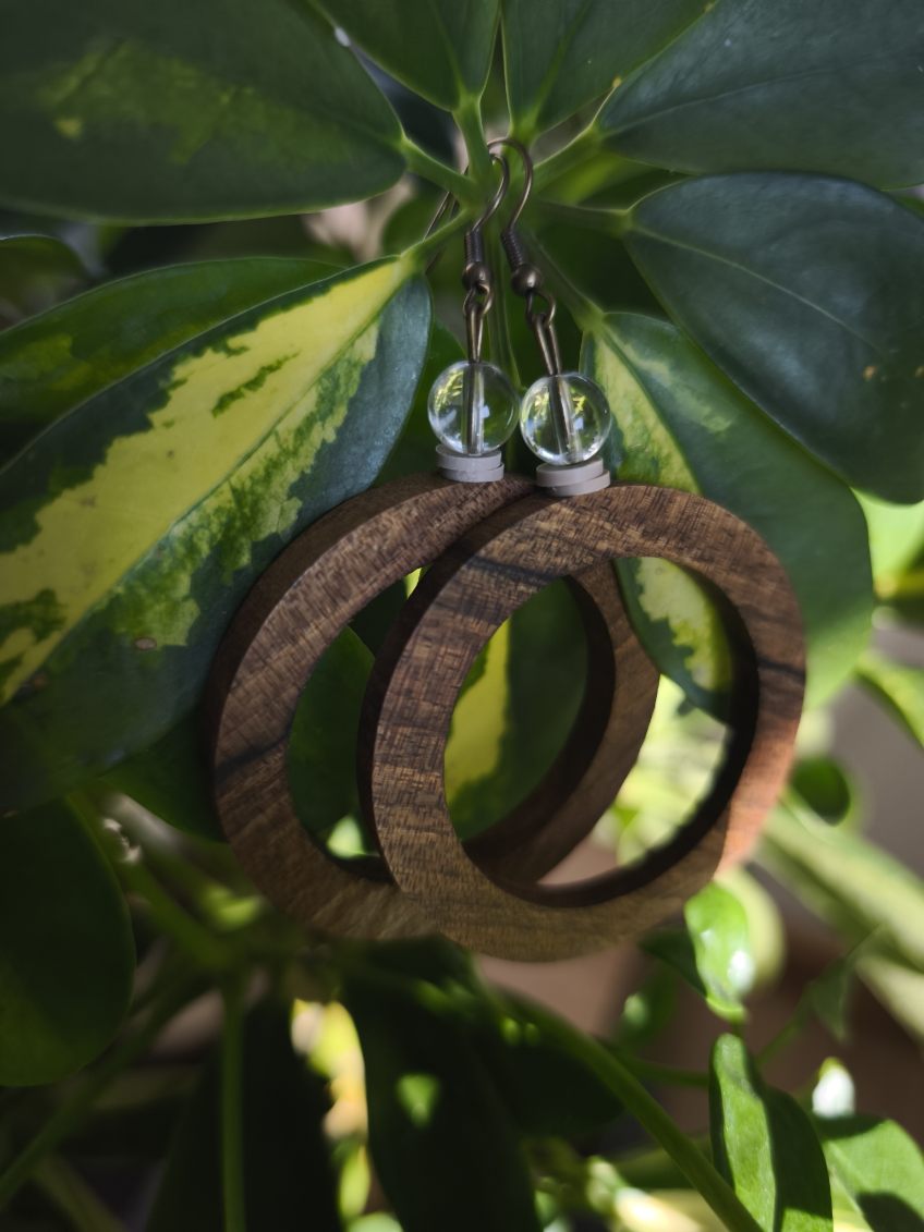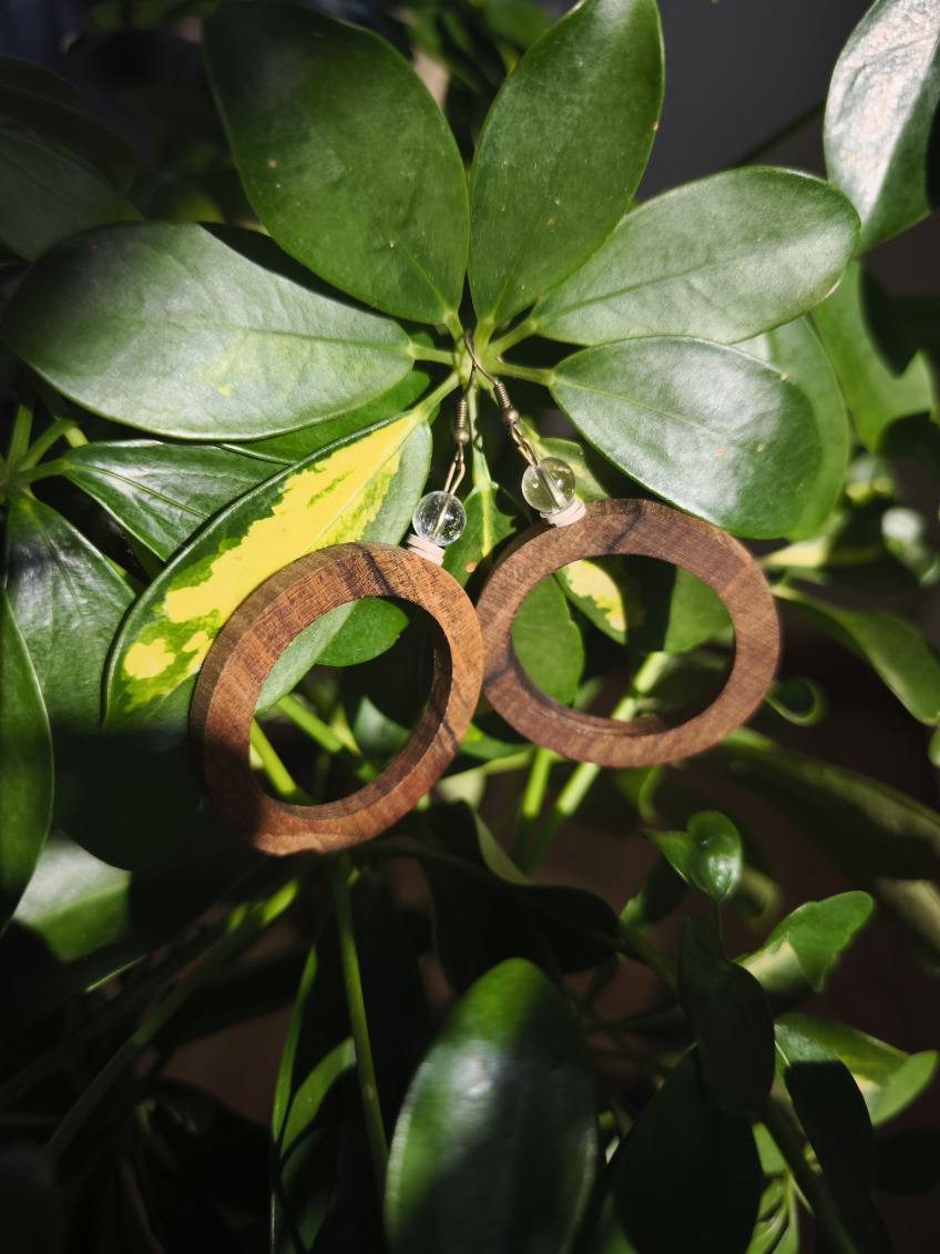 Créoles en bois de noyer et perles en cristal de roche.